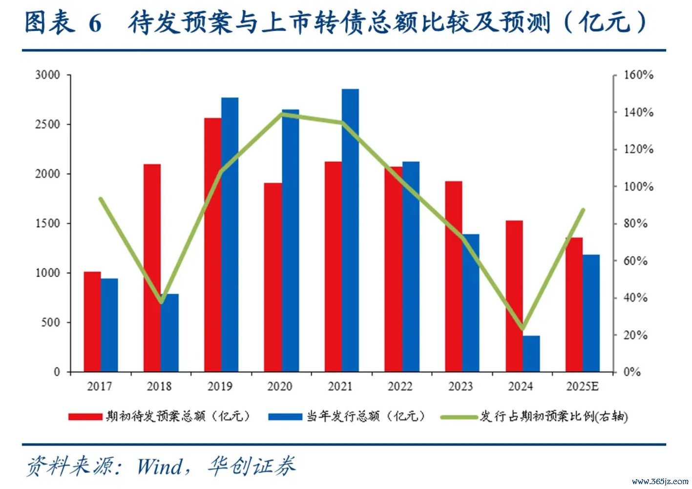 另在转债供需结构上,华创证券研报近期指出,供给端,2019-2021年转债热潮下发行节奏快,发行总额占期初待发预案总额比例超过100%,2022年后发行恢复冷静。考虑前述审批节奏加速恢复,预计2025年发行节奏或恢复至2022-2023年的水平,预期2025年可发行约占年初待发预案87%的转债,也即约发行1190亿元,2025年净供给收缩394亿元,相较2024年净供给收缩约1145亿元。