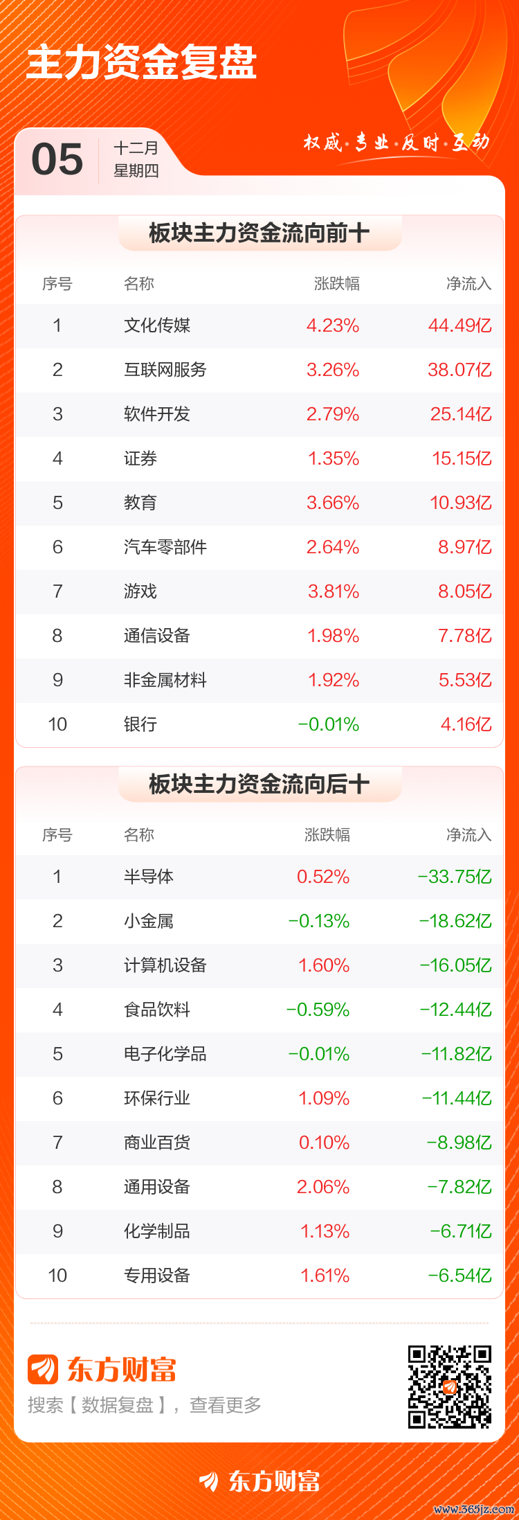 12月5日,沪指涨0.13%,深成指涨0.29%,创业板指涨0.36%。两市成交额1.50万亿,较上个交易日缩量1645亿。数据显示,今日大盘主力资金净流出48.54亿。文化传媒、互联网服务、软件开发等板块主力资金流入排名居前,其中文化传媒净流入44.49亿元。